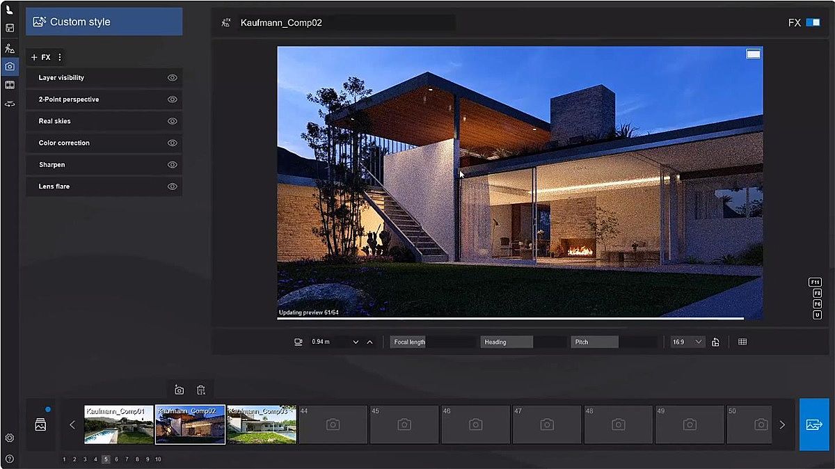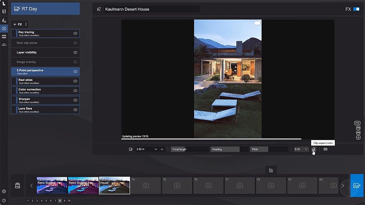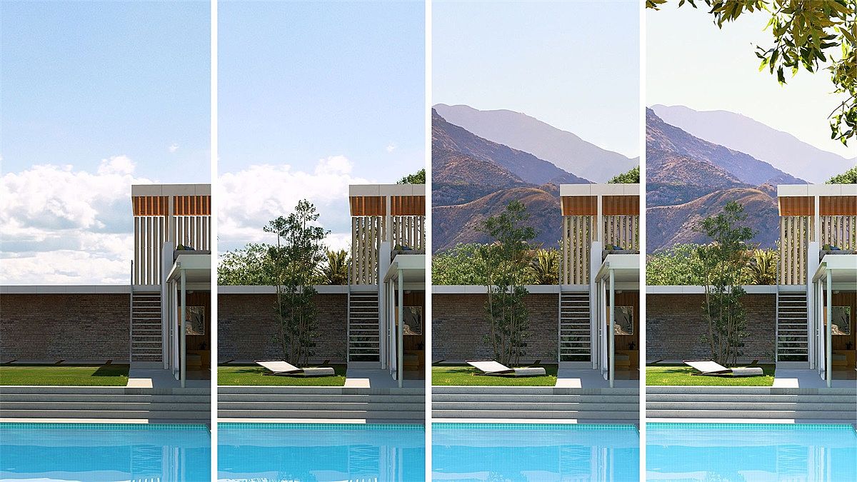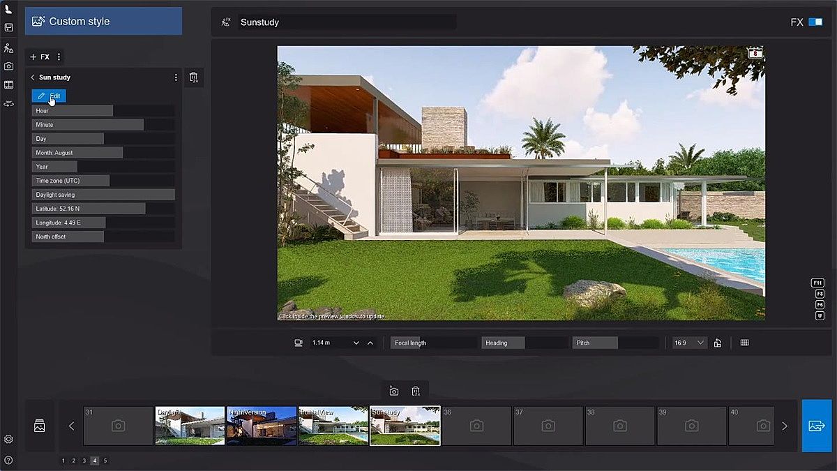 要將渲染與現有照片匹配,照明和天氣條件需要完全相同。Sun studies (太陽研究) 效果可以通過模擬世界特定部分在特定日期或時間的照明條件來幫助實現此目的。在照片模式下的 +FX 中找到它,打開它,然后相應地調整設置。