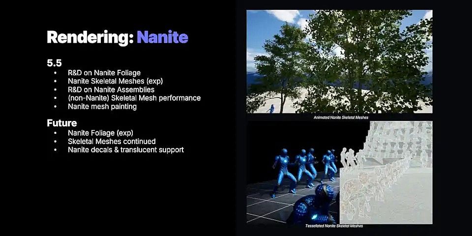 Unreal Engine 5.6將對**Nanite Foliage**(即在Nanite中支持樹木等資產)進行一些“重大更新”;脽羝刑岬“Nanite decals & translucent support”(Nanite貼花和半透明支持),可能指的是在Nanite中使用半透明混合模式的網格貼花支持。這項工作旨在解決動態移動樹木的渲染問題,并使Nanite Foliage與Unreal Engine的動態全局光照系統Lumen更好地協同工作。