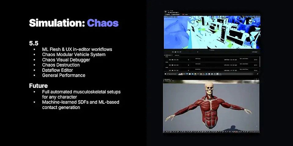 在Unreal Engine的Chaos Physics工具集中(包括軟體系統Chaos Flesh),Epic計劃“在[Unreal]編輯器內完全自動化肌肉骨骼模擬”;脽羝羞提到新的機器學習功能,繼Unreal Engine 5.2中引入的ML Deformer之后,包括機器學習SDF和接觸生成。