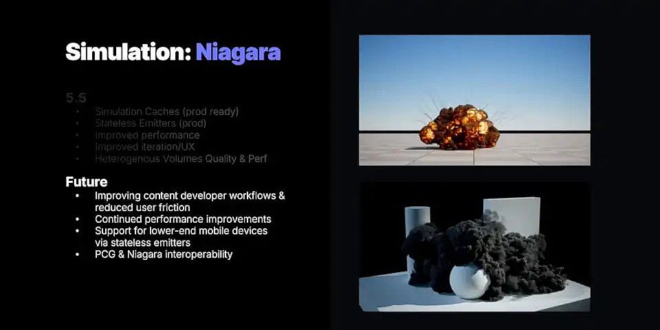 Unreal Engine的基于粒子的VFX系統Niagara的計劃變化主要是工作流程改進,Brussee指出該工具集“變得過于專家級”。然而,Epic還計劃使Niagara和PCG互操作,使得不同類型的模擬能夠“相互通知和影響”。