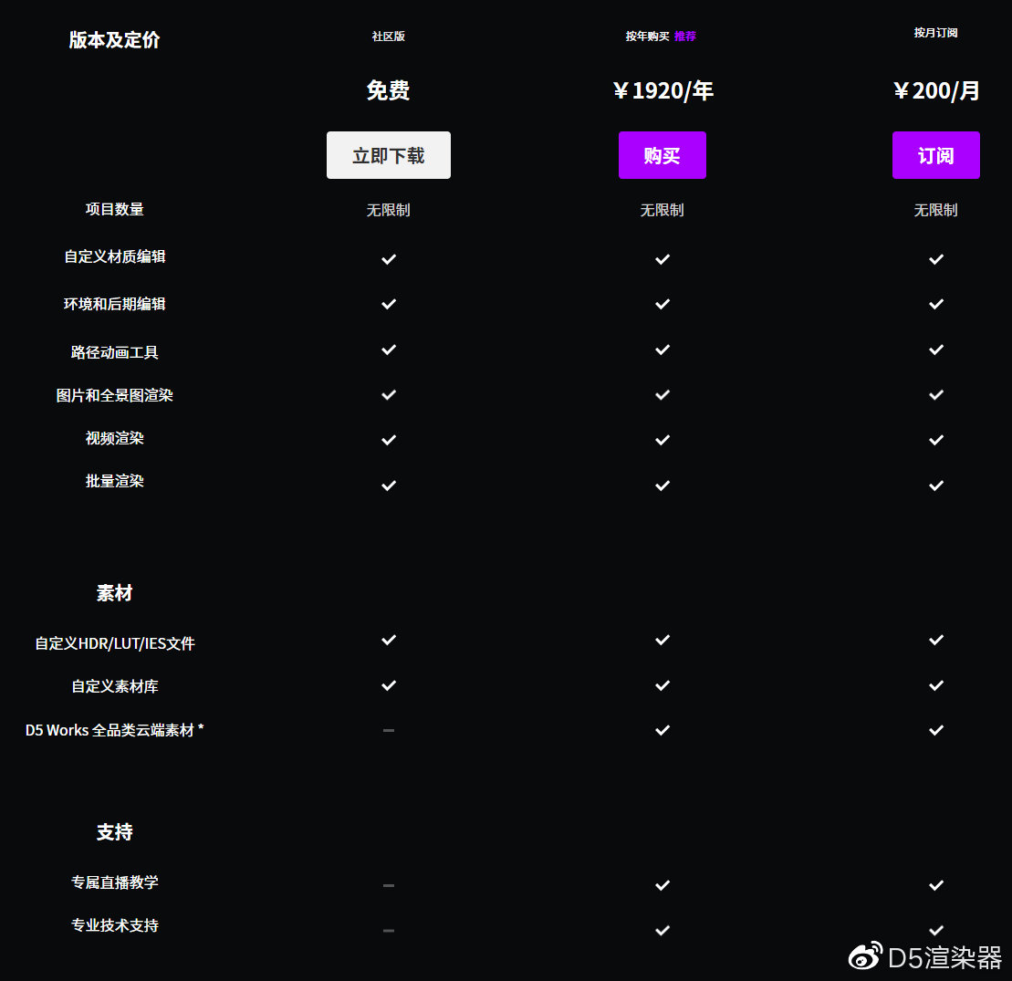 目前,針對不同使用需求的用戶,D5渲染器提供3種服務方案與訂價。