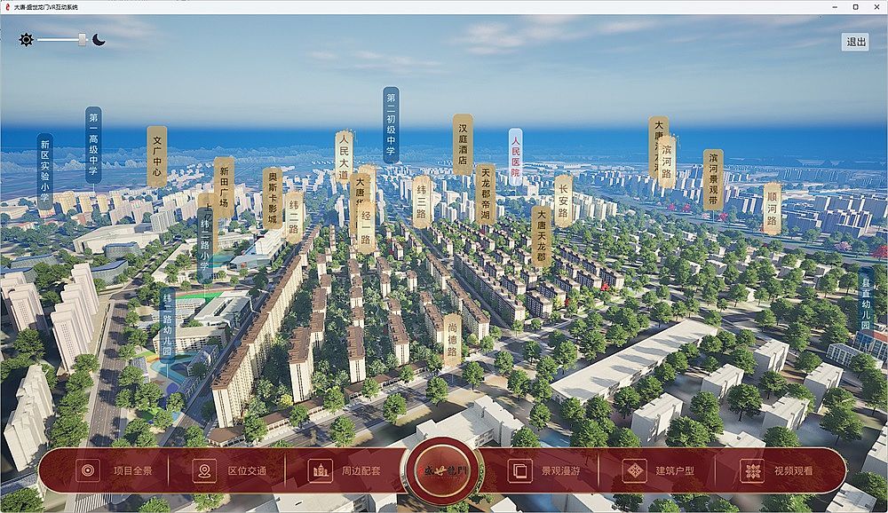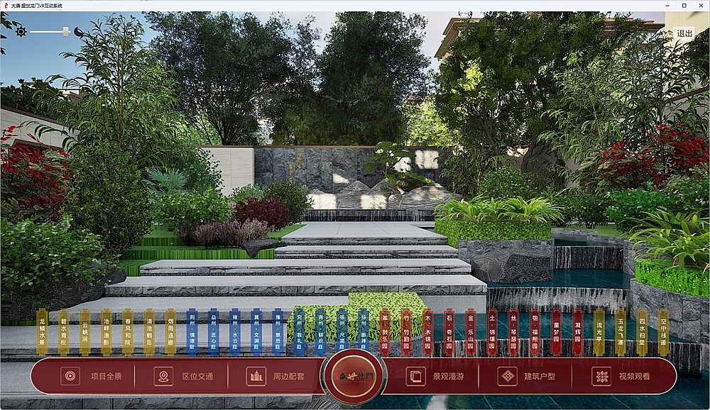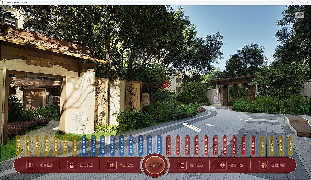 VR互動展示系統,使用UE引擎,全方位呈現整個小區的各個景觀節點,全景交互,可自由行走游覽。